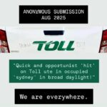 Anonymous submission Aug ’25: “Quick and opportunist ‘hit’ on Toll ute in occupied ‘sydney’ in broad daylight!” We are everywhere. Visit tolldeath.noblogs.org for more information.