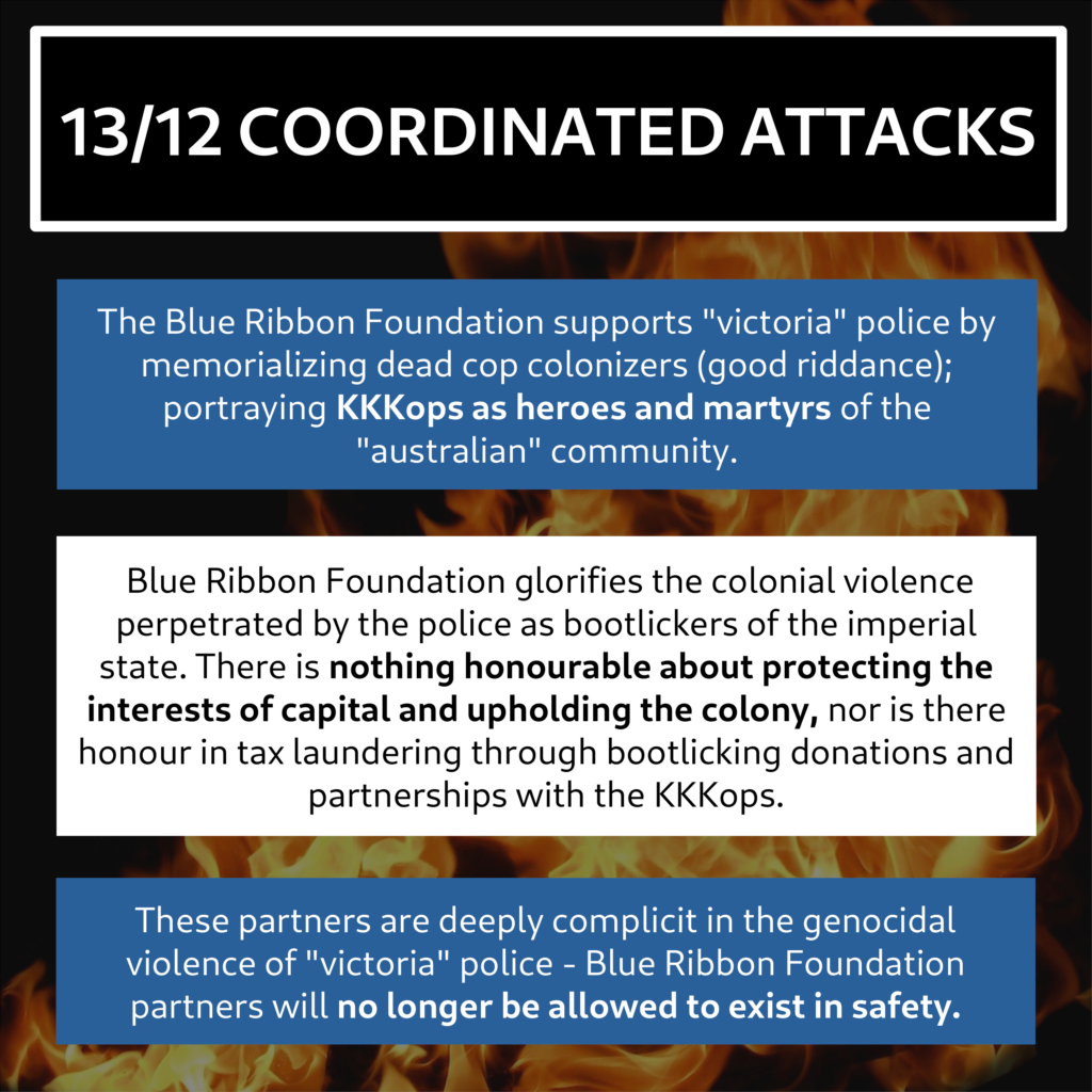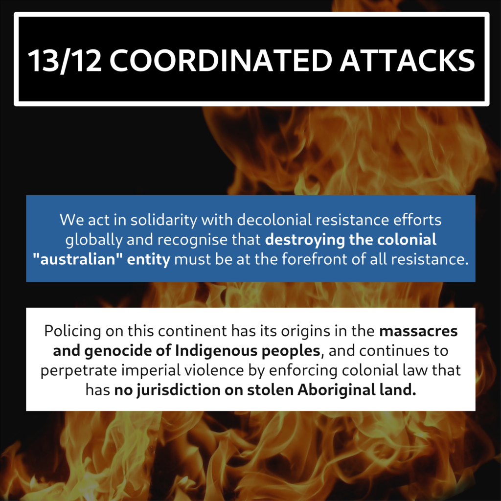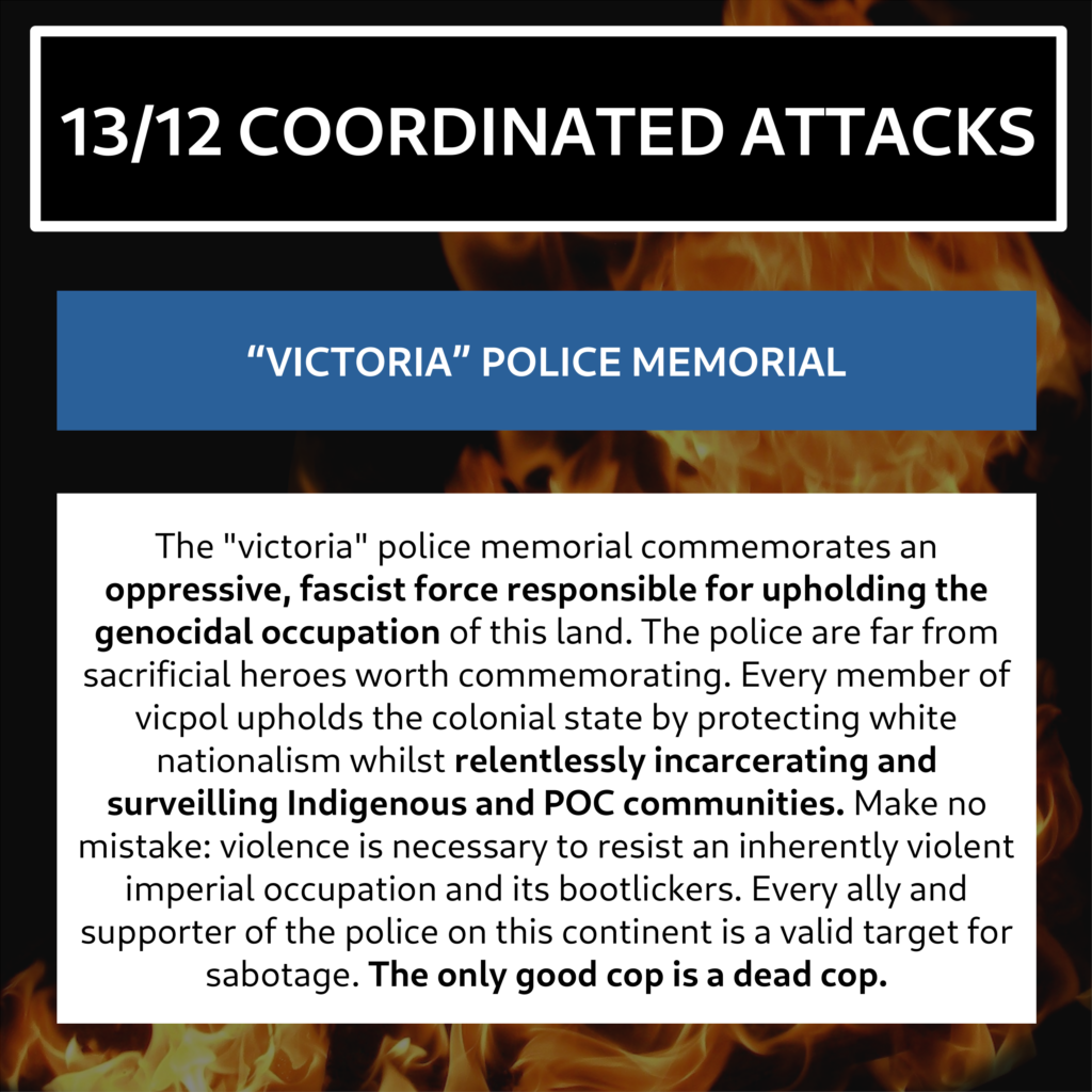 “A number of coordinated actions against ‘victoria’ police and their bootlickers have taken place in the lead up to 13/12.”