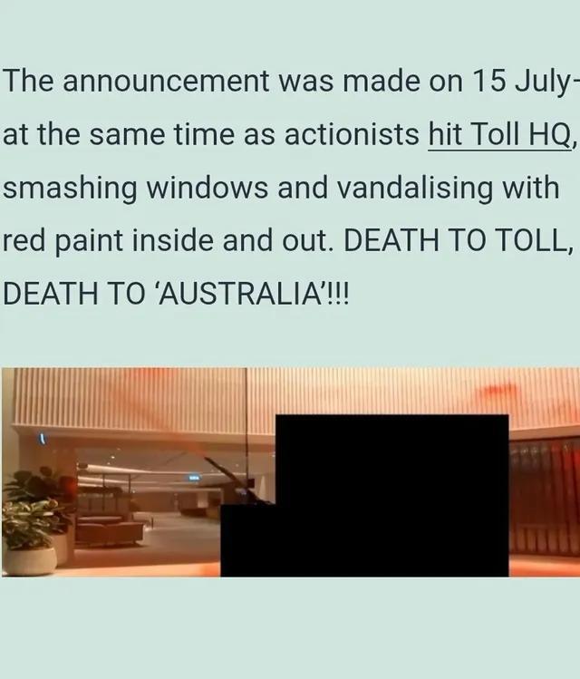 The announcement was made on 15 July – at the same time as actionists hit Toll HQ, smashing windows and vandalising with red paint inside and out. DEATH TO TOLL, DEATH TO ‘AUSTRALIA’!!!
