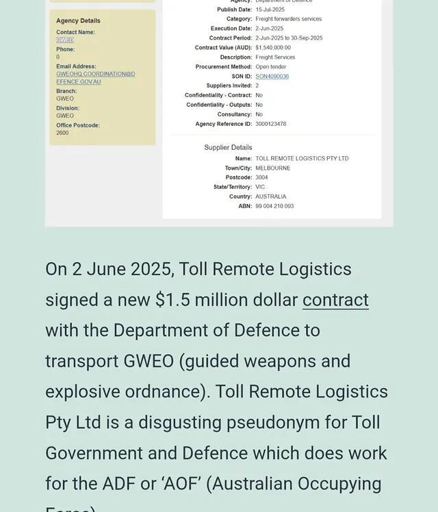 “On 2 June 2025, Toll Remote Logistics signed a new $1.5 million dollar contract with the Department of Defence to transport GWEO (guided weapons and explosive ordnance). Toll Remote Logistics Pty Ltd is a disgusting pseudonym for Toll Government and Defence which does work for the ADF or ‘AOF’ (Australian Occupying Force).